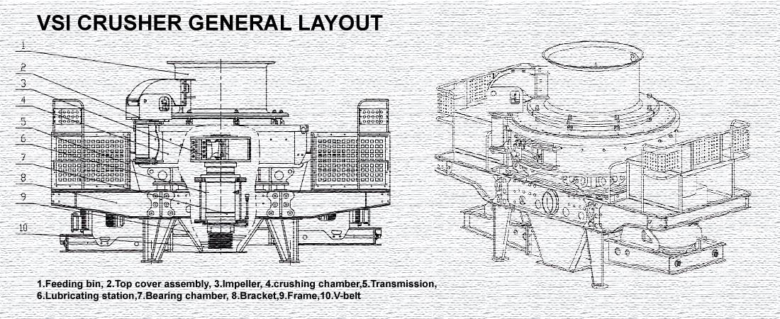 The materials fall into impeller with high-speed rotation vertically. On the force of high-speed centrifugal, the materials strike to the other part of material in a high speed. After mutual impacting, the materials will strike and rub between the impeller and the casing and then be discharged straight from the lower portion to form a closed multiple cycles. Final product is controlled by screening equipment to meet the requirement.